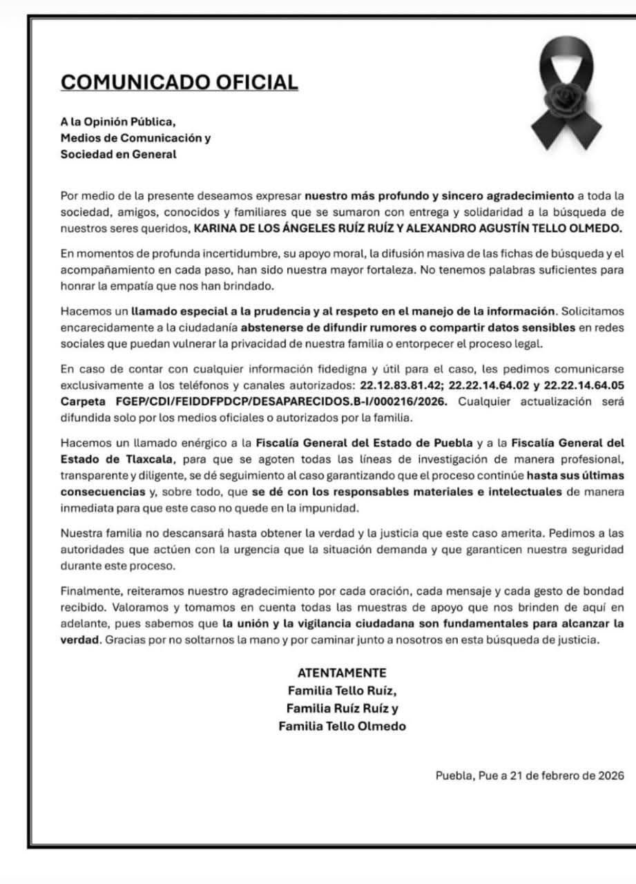 El Gobierno de Puebla expresó respaldo institucional a los familiares de Karina de los Ángeles Ruiz Ruiz y Alexandro Agustín Tello Olmedo, el matrimonio localizado sin vida después de viajar hacia Tlaxcala para celebrar un cumpleaños, informó el titular de…